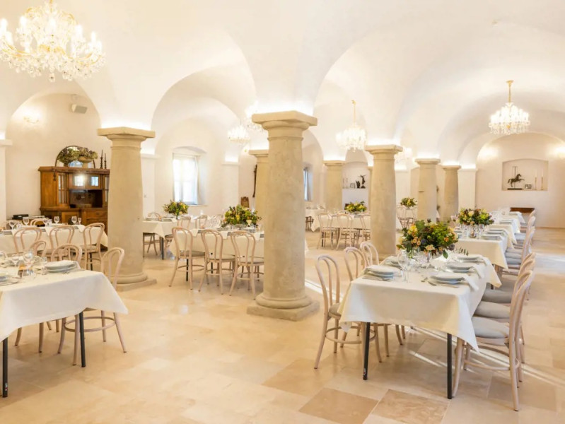 Hodovňa s kapacitou 130 osôb je ideálna pre veľké svadby a plesy, ponúka honosnú atmosféru s historickými stĺpmi.