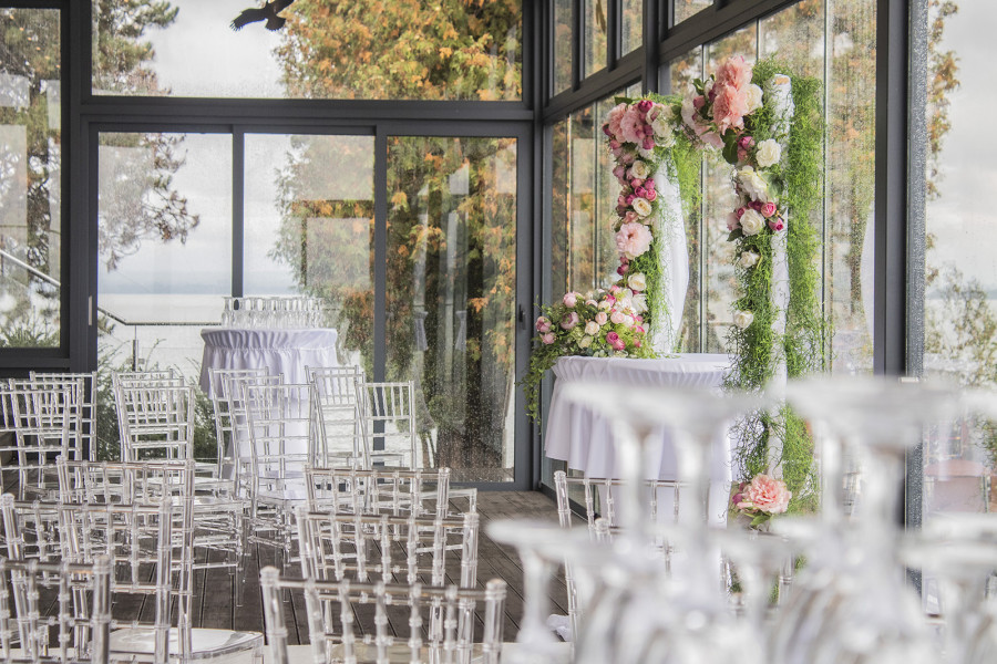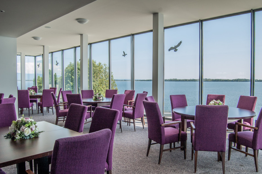 Reštaurácia ponúka priestranné a moderné prostredie pre svadobné oslavy, s prepojením na kongresovú miestnosť a výhľadom na šíravu.