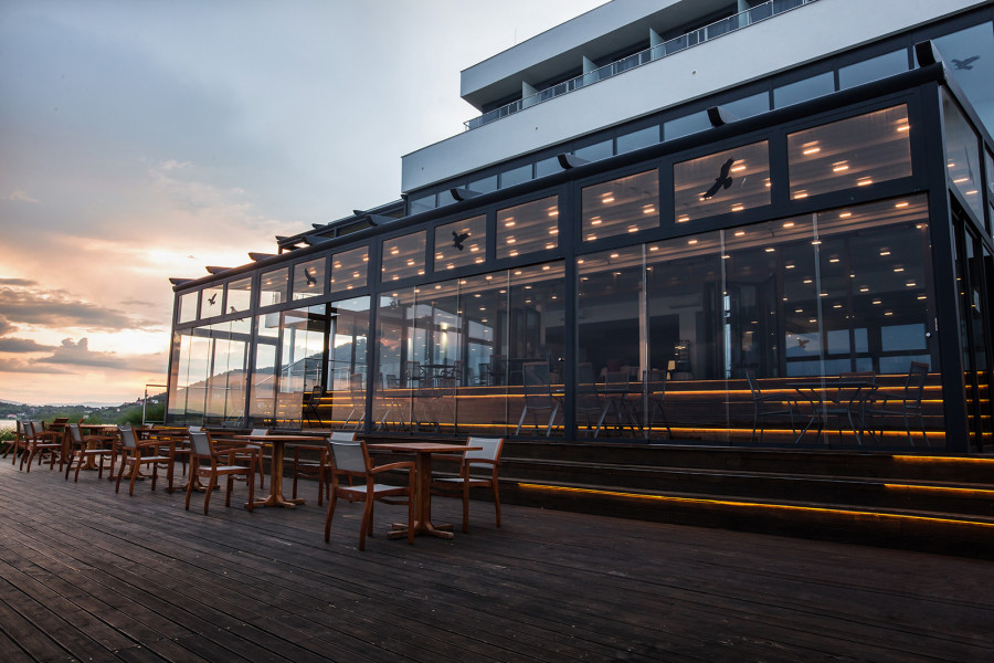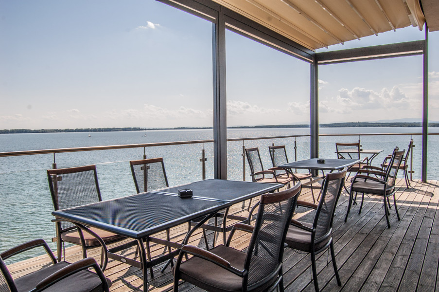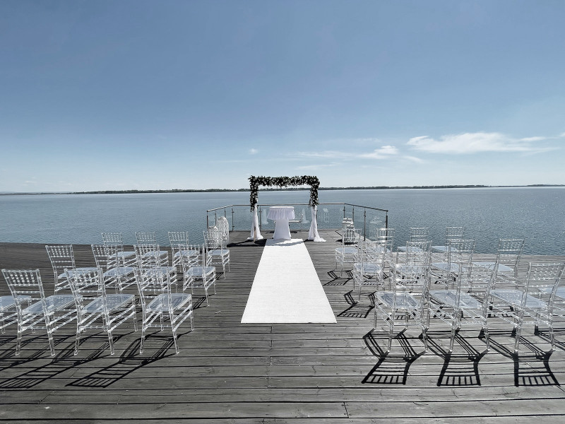 Terasy s plávajúcim mólom a plážovým barom ponúkajú jedinečné miesto pre letné svadobné recepcie a oslavy.