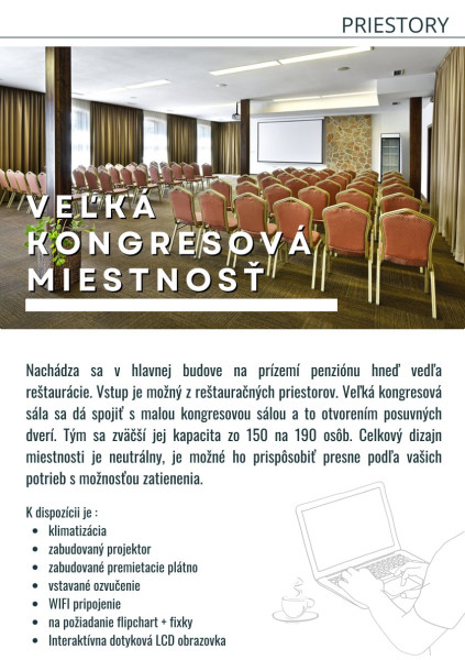 - Premietanie: Dataprojektor a výsuvné plátno (Veľká a Malá konferenčná sála, Konferenčný priestor dependance), LED TV (Malá banketka), plátno na stojane (Kongresová terasa).