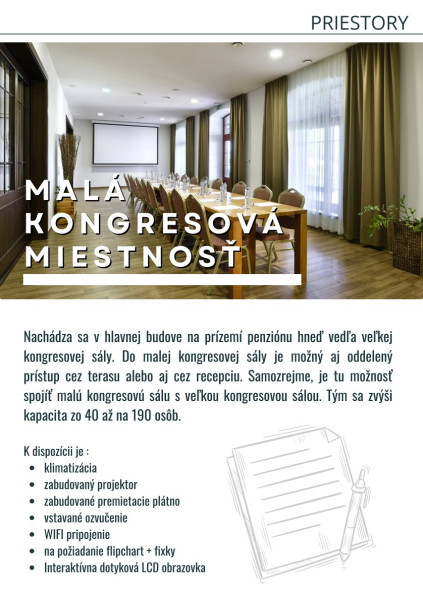 Malá konferenčná sála, situovaná na prízemí penziónu vedľa Veľkej konferenčnej sály, je vhodná pre školenia, workshopy alebo menšie stretnutia. Prístup je možný cez terasu alebo recepciu.