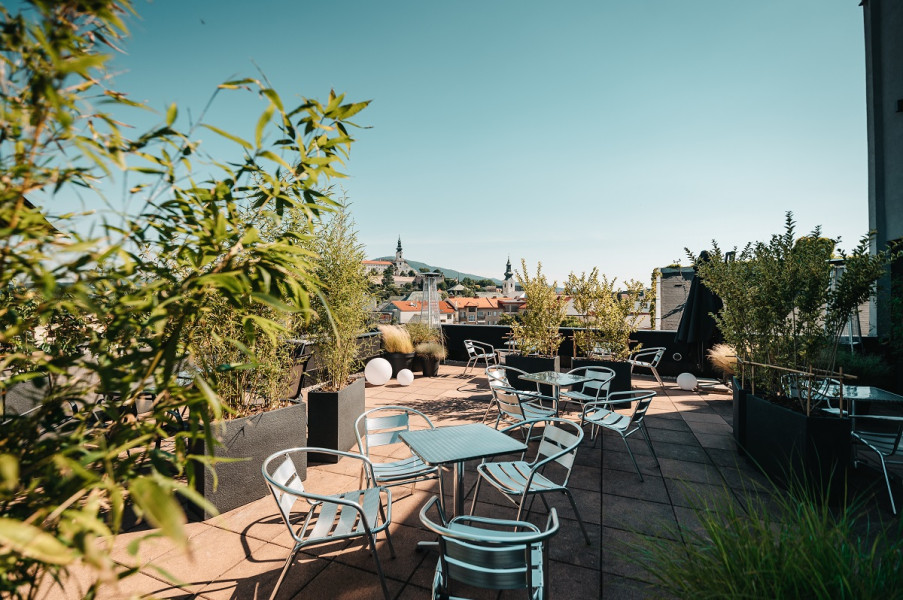 Garden Terrace ponúka panoramatický výhľad na Nitru, ideálny pre svadobné recepcie alebo welcome drink v príjemnom prostredí.