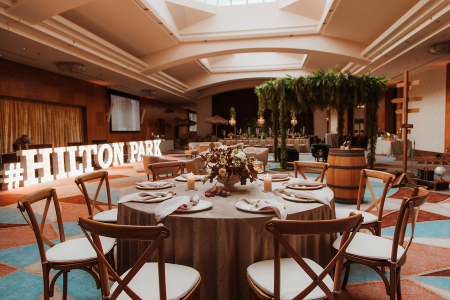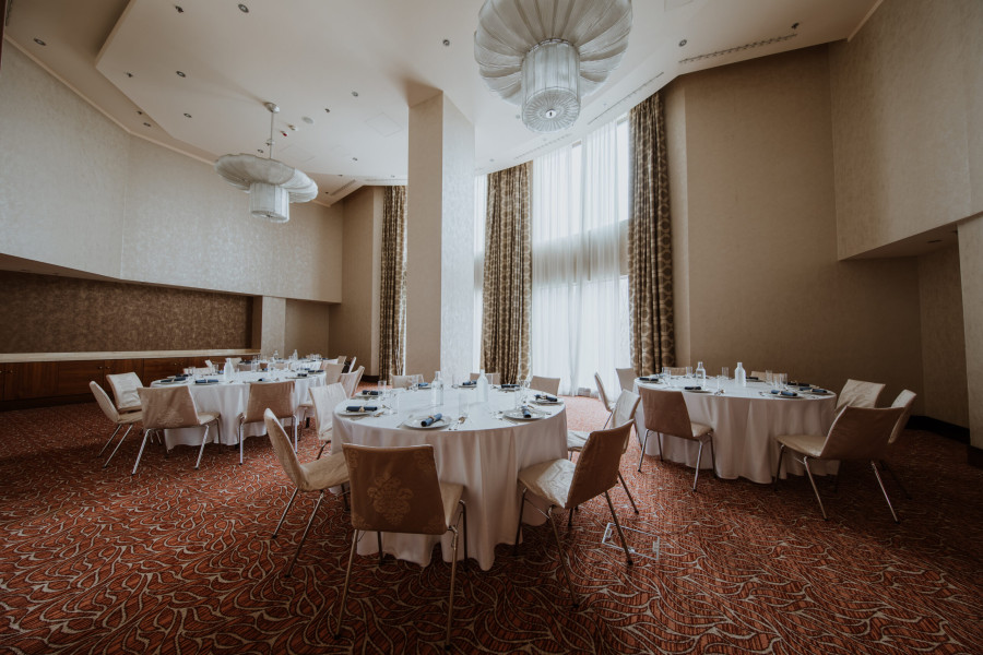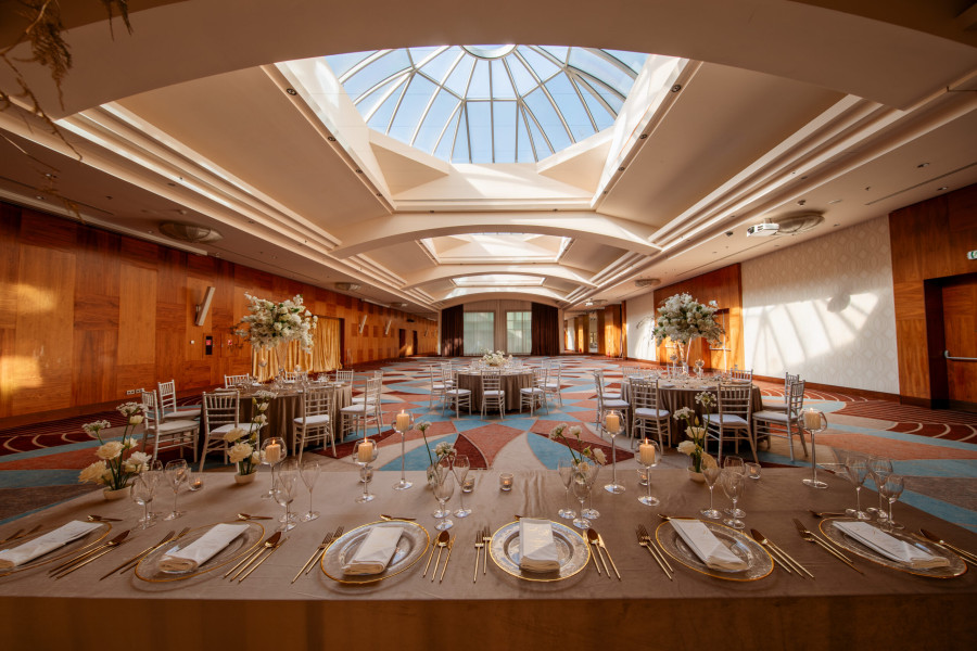 Hilton Ballroom je ideálny pre veľké svadobné oslavy, s priestranným interiérom, denným svetlom a moderným vybavením, ktoré dotvára slávnostnú atmosféru.