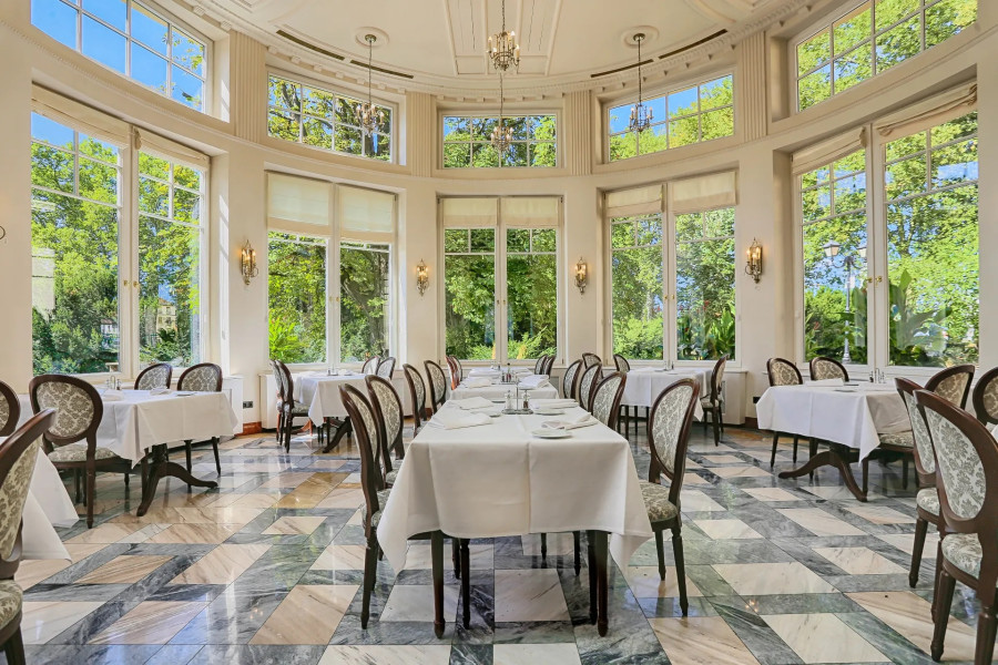 Kaviareň Alexander s letnou terasou a výhľadom na park je vhodná pre recepcie alebo stretnutia, s denným svetlom a moderným vybavením.