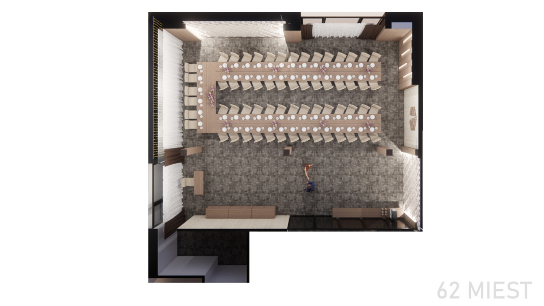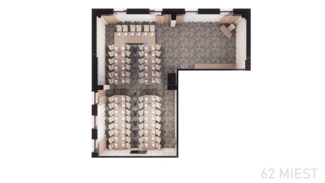 Spojením seminárnej miestnosti a salónika vzniká priestor s rozlohou 86 m², vhodný pre firemné akcie, školenia alebo svadby s väčšou kapacitou.